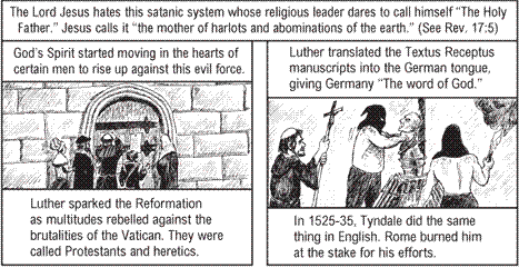 Vatican Roma had been forcefully opposing the translation of the Bible into English for over one hundred years. Once Vatican Roma saw they could not stop it, no matter how many they slaughtered, Vatican Roma determined to undermine it in what is now known as the Counter Reformation. By getting God's written Word to the layman in his own tongue, the Protestants had ultimately forced Vatican Roma to translate the Bible into English.