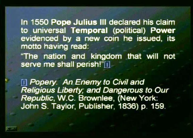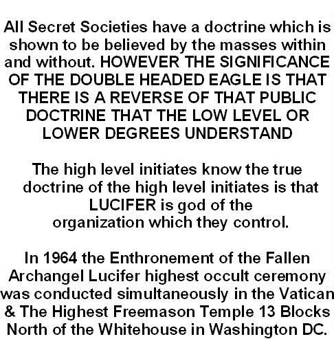 The outsiders, the masses, the uninitiated, and the low degree initiates are given to believe the symbol represents both religious and political sovereignty. To those who control the secret societies, the ones knowing THE SECRET of Secret Societies, it means that the ones who control the secret society hold a REVERSE Doctrine of the doctrine understood by the unititiated, and even the great majority of the members of the secret society. With rare exception it means that those in control of the secret society hold that Lucifer, satan, the devil is the god of the society which they control.