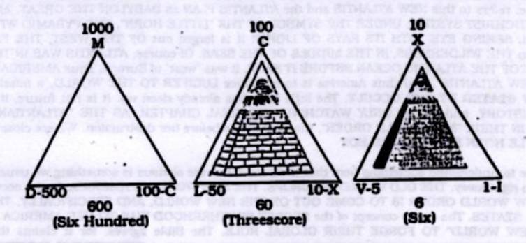 The first group is MDC. The pyramid has 1000 on the top. However, because the number system of the west is based on Rome's 10 base, and the old order number system of the east or ancient Babylon is based on 6, you may see again the first pyramid can represent 600 on both top and bottom. You see, 1000 is the same as 600 in the Babylonian system. D=500 and C=100. That is 600. So the FIRST THREE NUMERALS of MDC stand for 600. Either with the Roman 10 base numeral system and/or the Babylonian 6 base numeral system.