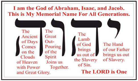 Gods name, therefore, reveals to us a pattern of first the Yod, the Fathers hand delivering the children of Israel out of Egypt. The first Hey shows us the Son of God bringing us Salvation and being our Redemption. The Vav is the Spirit of God, poured out to bind us together again. The final Hey is the Messiah returning on the clouds of Heaven with power and great glory. This is not a secret to us. All of these events share one thing in common to glorify Gods name.